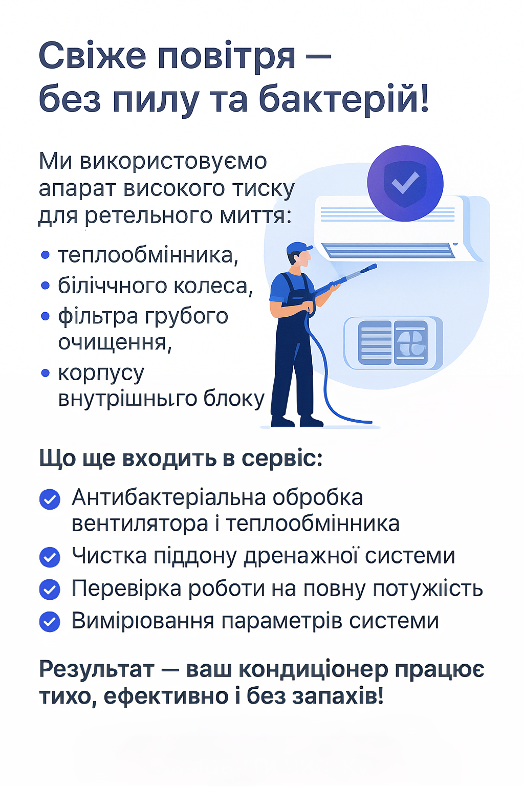 Ми використовуємо апарат високого тиску для миття теплообмінника та біличного колеса, а також для очищення фільтра грубого очищення та корпусу внутрішнього блоку.